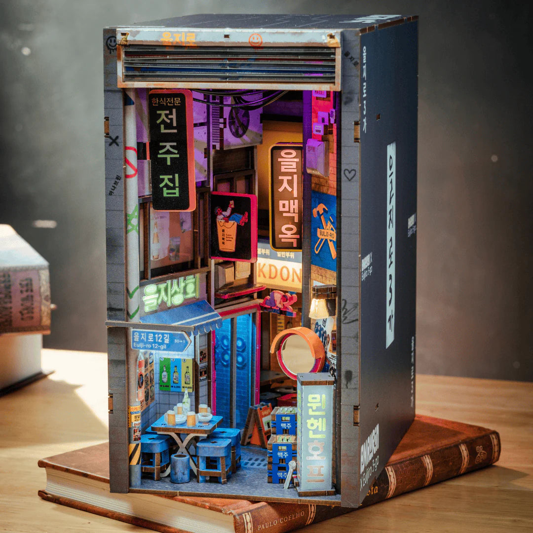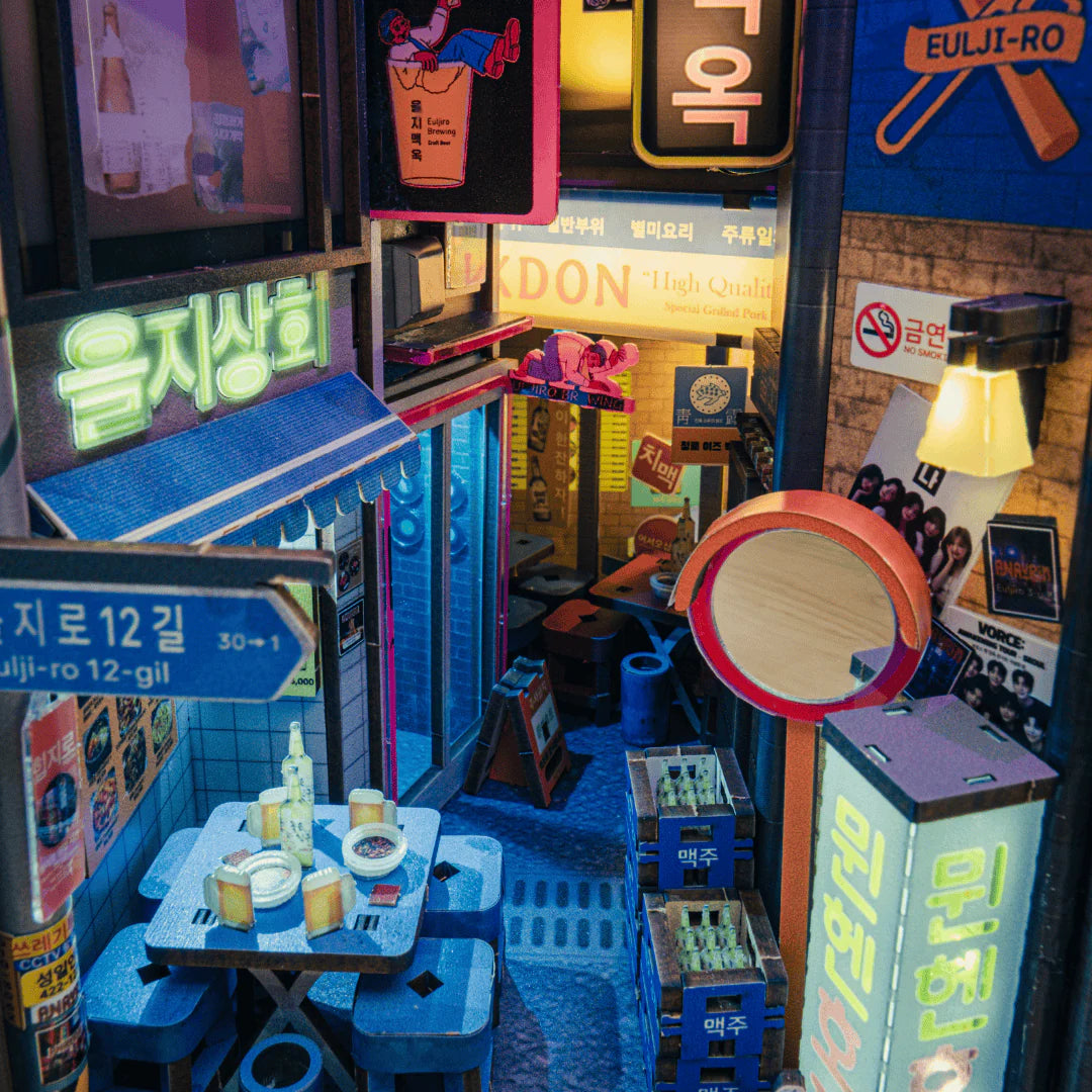 Step into the hidden backstreets of Seoul Hipjiro, inspired by Euljiro 3-ga’s neon-lit alleys and underground bars. The Seoul Hipjiro Book Nook Kit captures the city’s cyberpunk charm through glowing lights, vintage storefronts, and intricate details that bring the soul of Seoul after dark to your bookshelf.